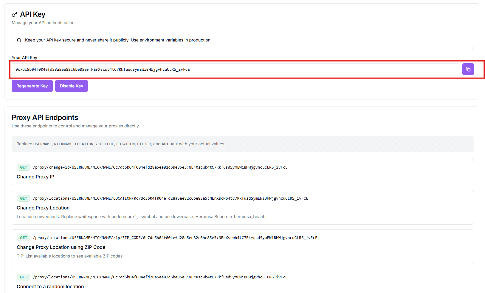 API Key Authentication is a secure method to verify the identity of a user or application accessing our platform Your API key is a secret key, akin to your credentials, and it must be kept confidential. Treat your API key with the same level of security as you would your password. This key is required for every request you make to our API, including changing proxy locations or updating the rotation of proxies.